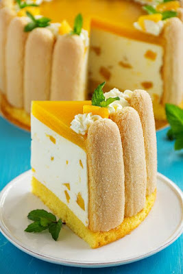 Chemiser le cadre d’un film alimentaire, garnir de boudoirs préalablement trempés dans du jus de mangue puis placer la génoise au fond .