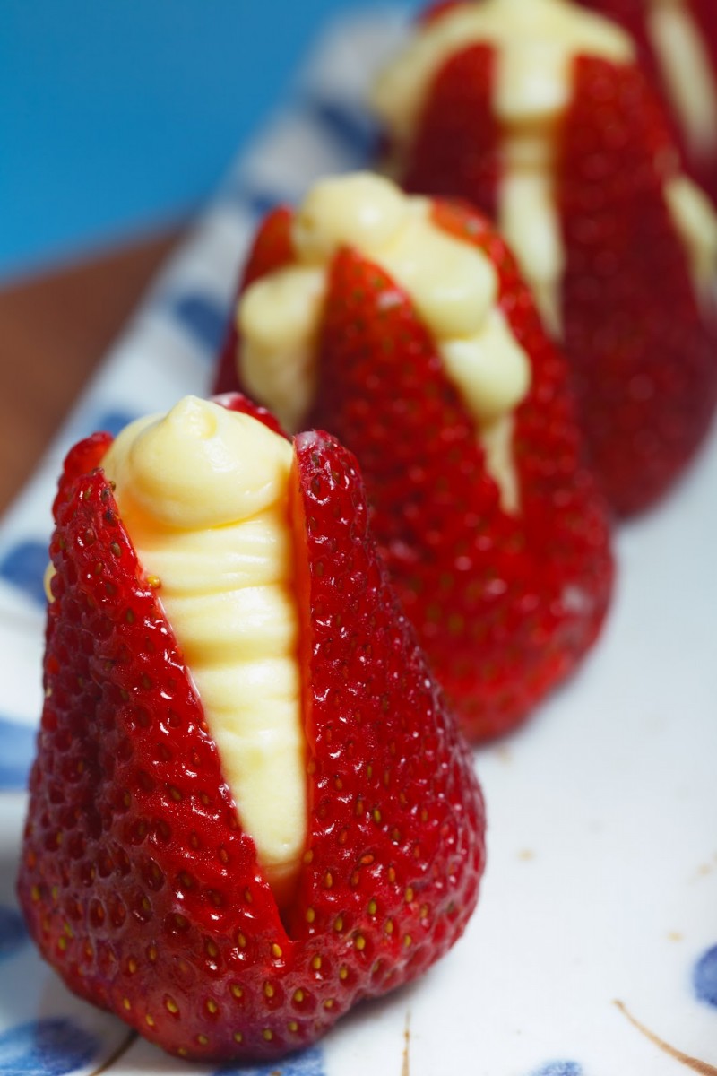 Dans un bol, mélanger le fromage à la crème, le sucre et la vanille ensemble. Mettre la préparation dans une poche à douille et remplir les fraises.
